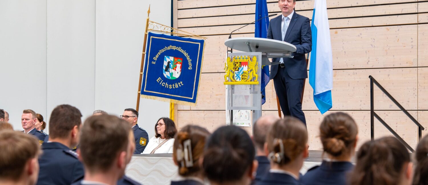 Verstärkung für die Bayerische Polizei: Bayerns Innenstaatssekretär Sandro Kirchner begrüßte in Eichstätt rund 120 neu eingestellte Polizistinnen und Polizisten. „Nun beginnt für Sie ein neuer Lebensabschnitt. Mit Ihrer Berufswahl übernehmen Sie Verantwortung für die Sicherheit der Menschen in Bayern. Wir verstehen den Polizeiberuf als Dienst von Menschen für Menschen.“